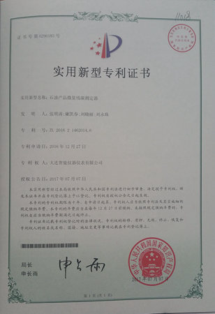 石油產(chǎn)品微量殘?zhí)繙y(cè)定器專利證書